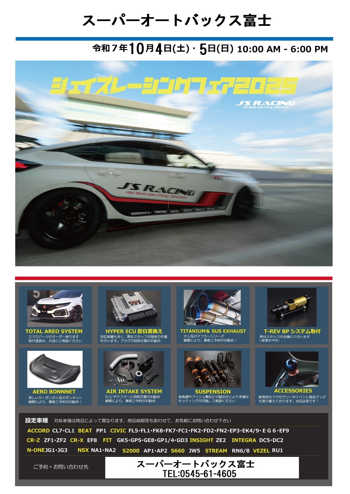 スーパーオートバックス富士店にて、ジェイズレーシングフェアが下記日程で開催されます。 2025年10月4日(土