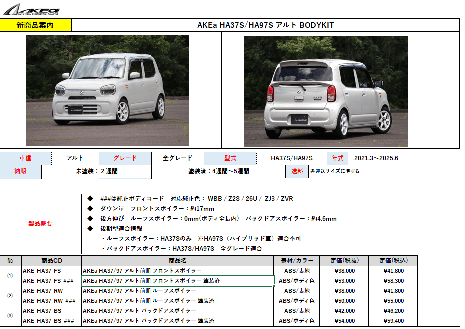 【新商品】AKEa SUZUKI アルト前期 A37S/HA97S BODY KIT発売