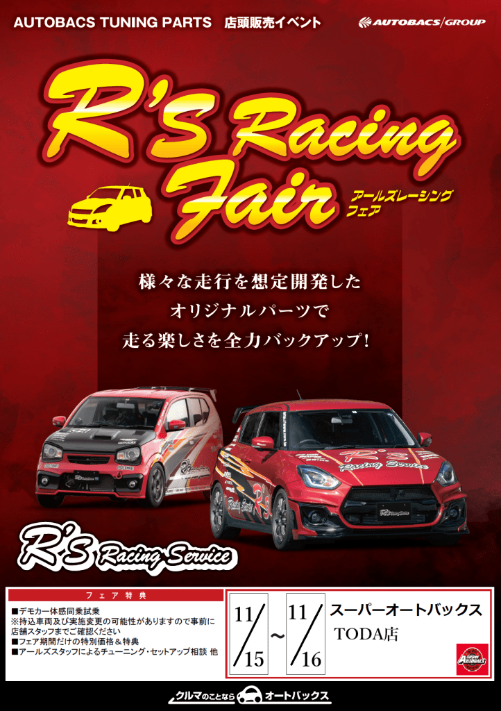 スーパーオートバックスTODA店にて、アールズレーシングフェアが下記日程で開催されます。