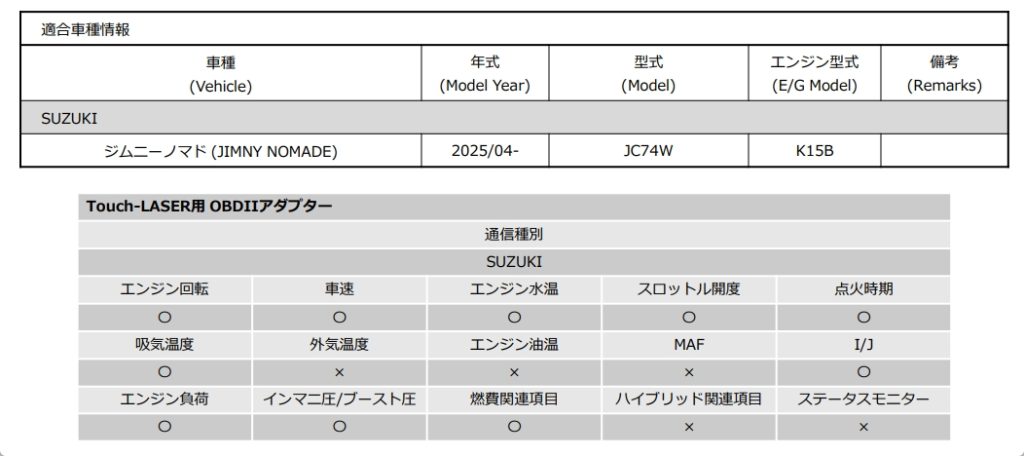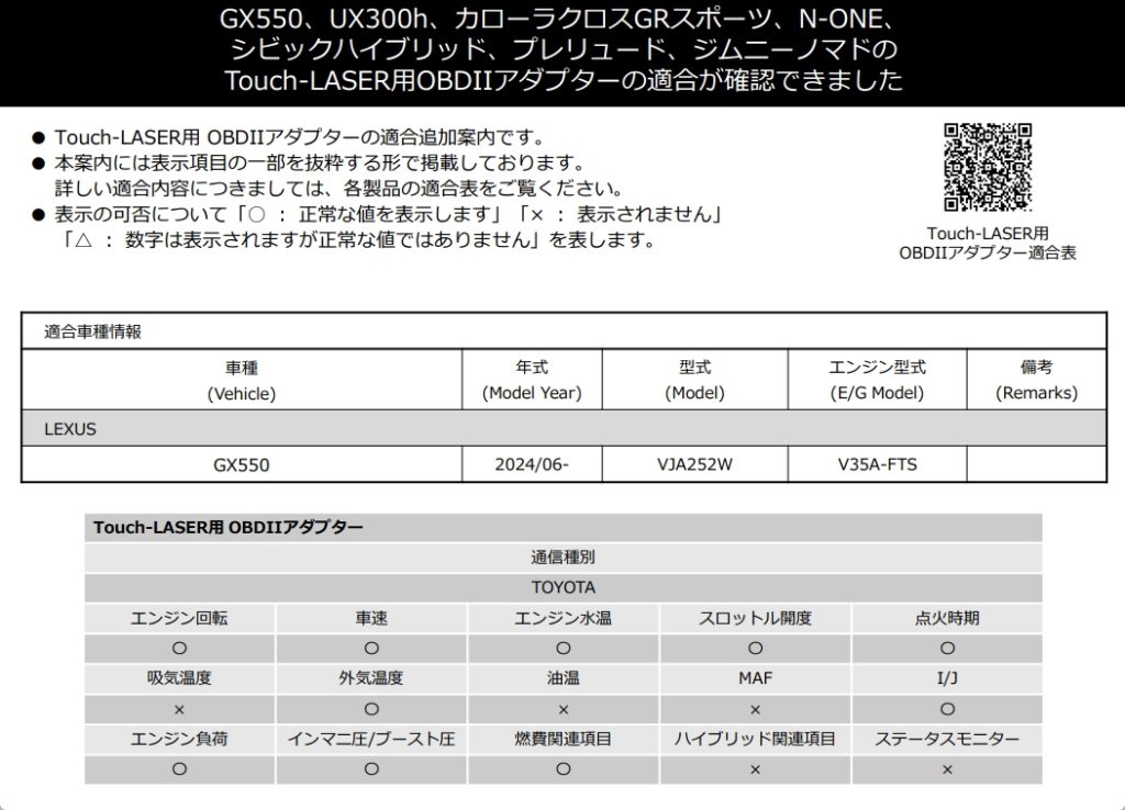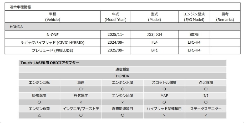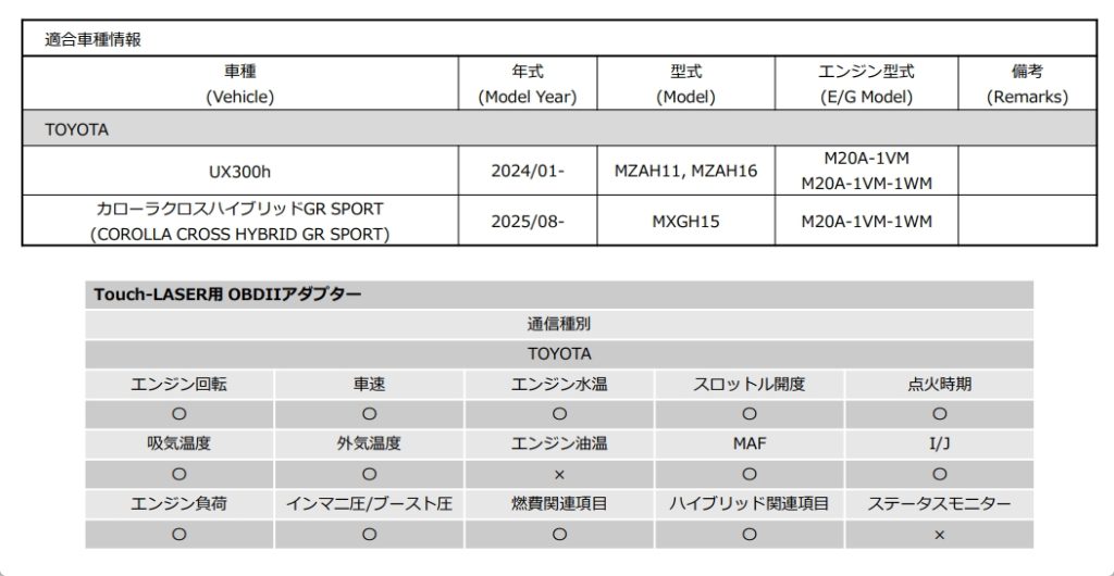 【適合追加】Touch-LASER用OBDIIアダプターの車種適合追加
