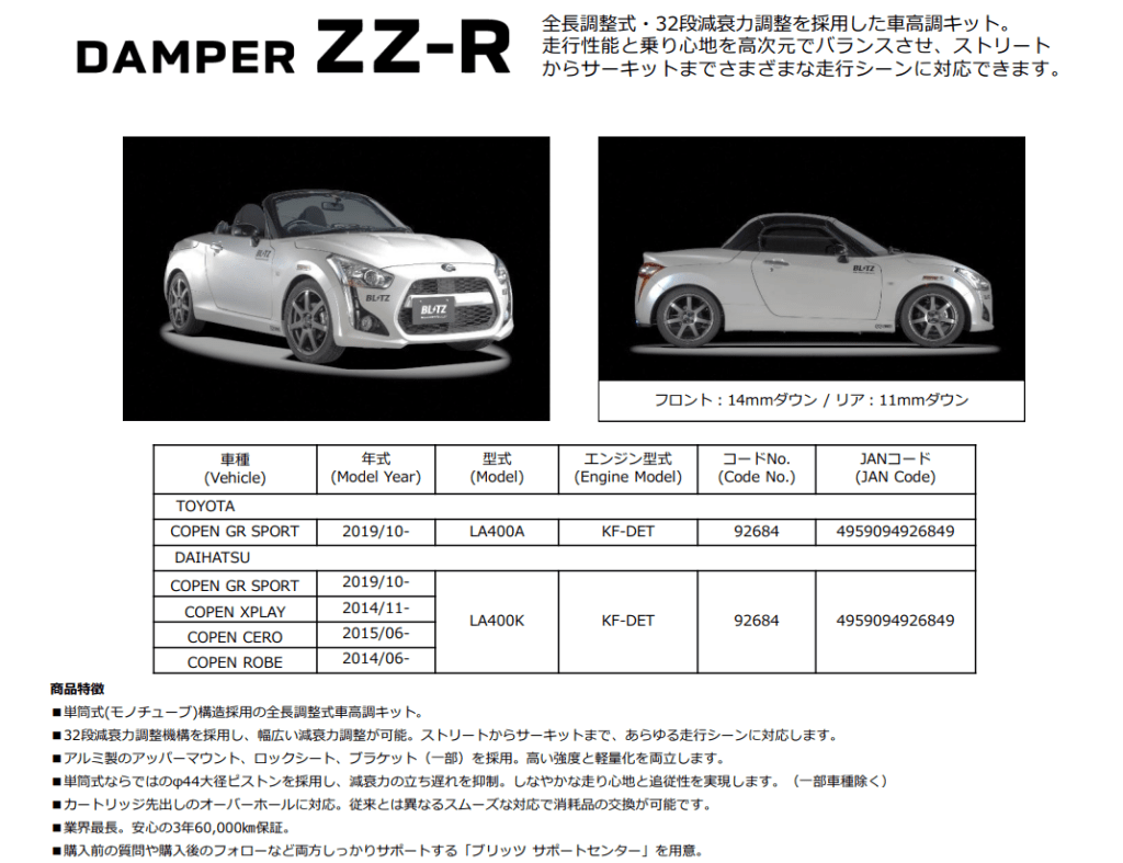 【新製品、適合品番変更】BLITZ 車高調キット「DAMPER ZZ-R」 TOYOTA COPEN GR SPORT (LA400A) / DAIHATSU COPEN (LA400K)他 用 販売